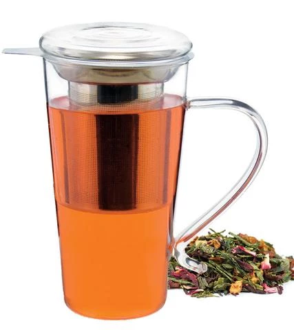 The Marbella is the perfect glass infuser tea mug for making your steeped tea. The glass cup is made from borosilicate, heat-resistant glass, includes an 18-8 stainless steel infuser and glass cover. The cover is perfect for keeping your tea warm and also doubles as a holder for your infuser when your tea is done steeping. The Marbella is perfect for all loose leaf teas.