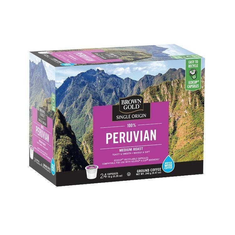 Brown Gold Peruvian roast has a toasty smooth, medium body with low acidity and a touch of sweetness. No compromise.