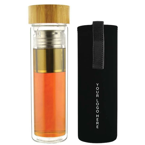 Material: Borosilicate glass bottle, bamboo lid, 18/8 stainless steel tea infuser, stainless steel cover plate inside lid
