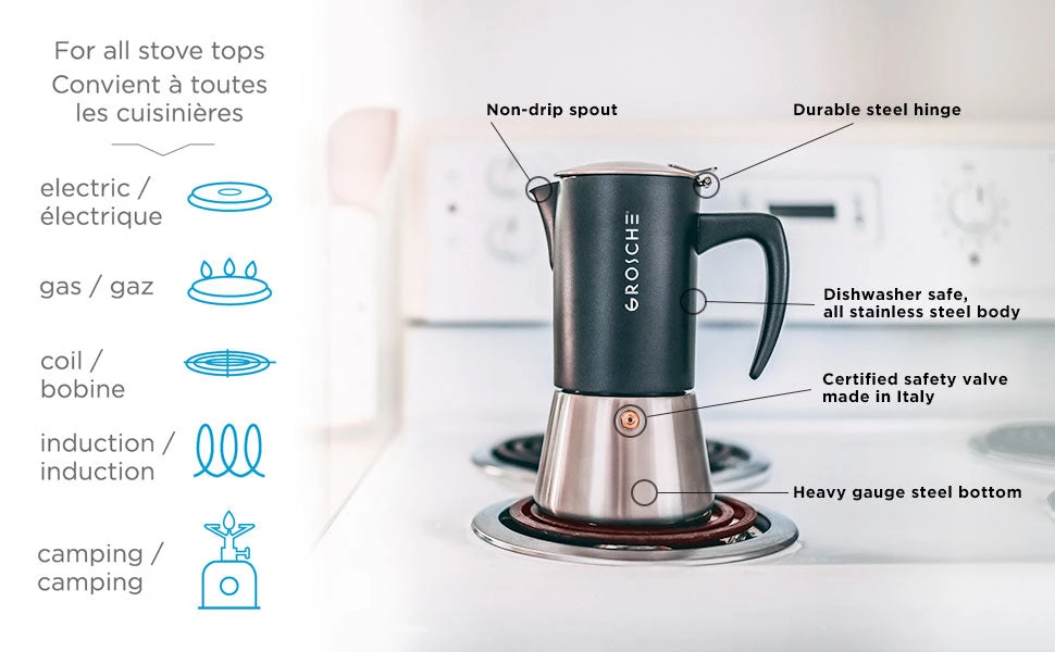With the same attention to detail, the Milano Steel is a stainless Steel Stovetop espresso maker. You will feel the quality the moment you hold it in your hands. The Satin finish, the subtle curves of the handle, and the matte black powder coating make this a classic and stylish way to make stovetop espresso in a stainless steel moka pot.