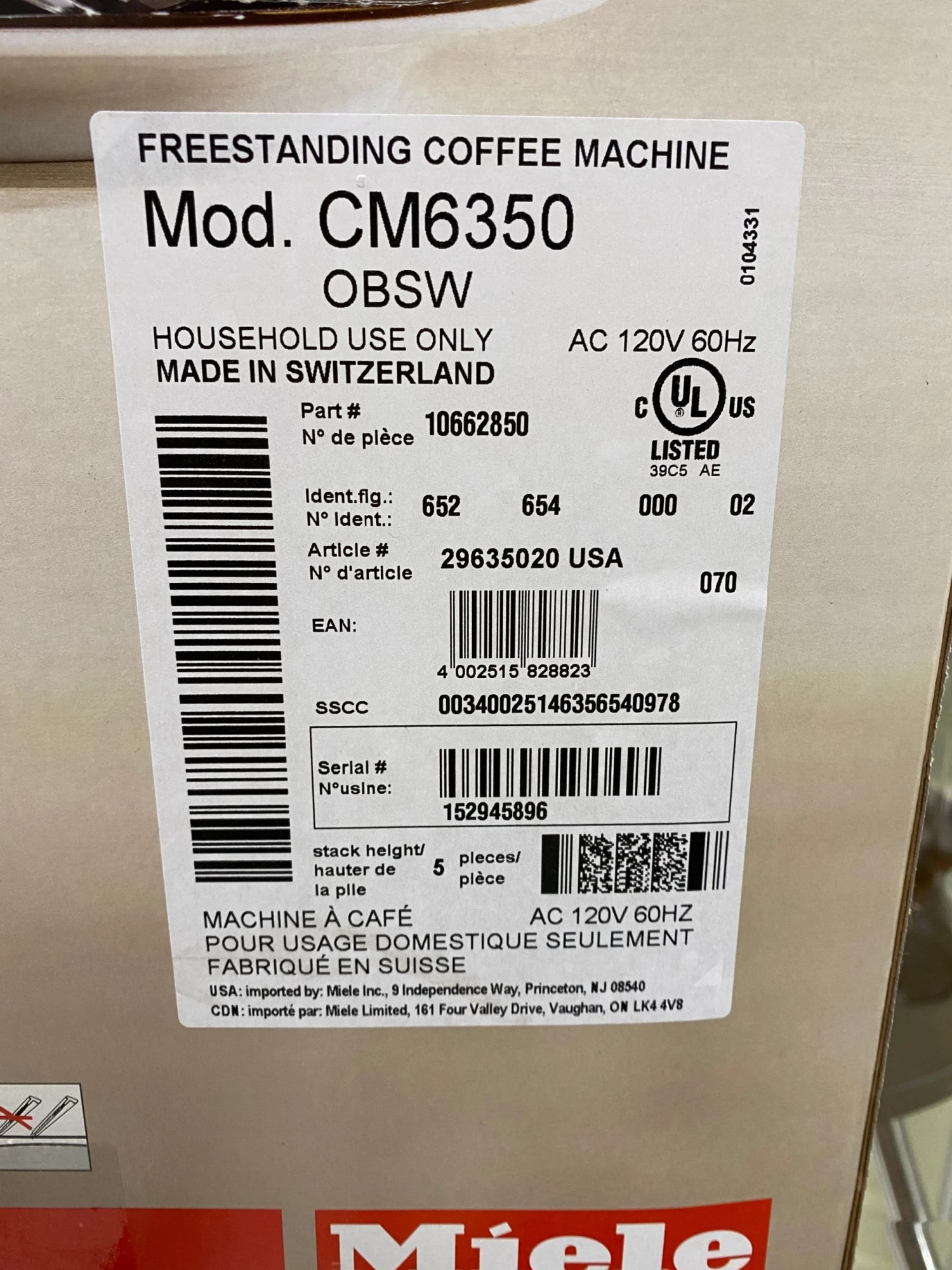 Open Box Miele and basically new, bean to cup Espresso Machine.