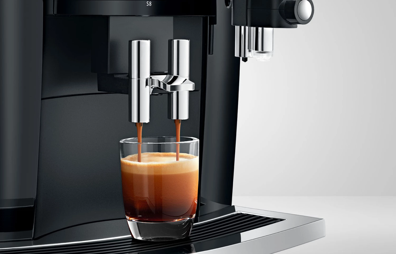 Characteristic JURA design reflects precision and quality down to the smallest detail. The new professional fine foam frother on the S8 is made from the highest quality materials and has a stunning look and feel. Specially designed for the preparation of speciality coffees with milk and milk foam, it makes latte macchiato and other beverages with the very best fine-textured foam – every time. Graphics and modern animations on the display make it easier than ever to use.