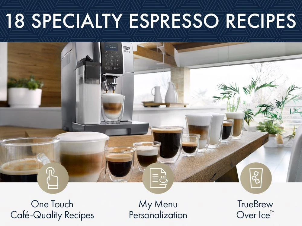 - 18 espresso and specialty coffee recipes, with a simple touch of a button, including latte, cappuccino, macchiato, espresso, iced coffee, ristretto, flat white and more.