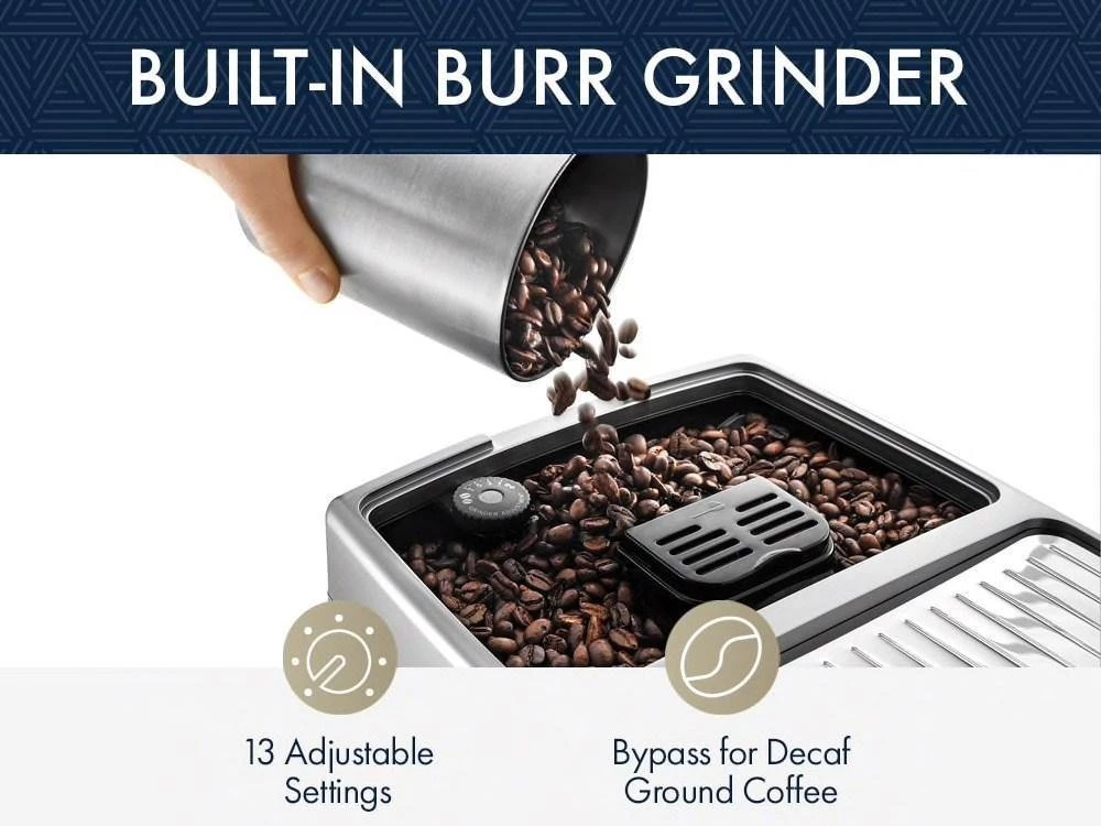 - Built-in conical burr grinder with 13 settings for always freshly ground coffee, for any beans of your choice.