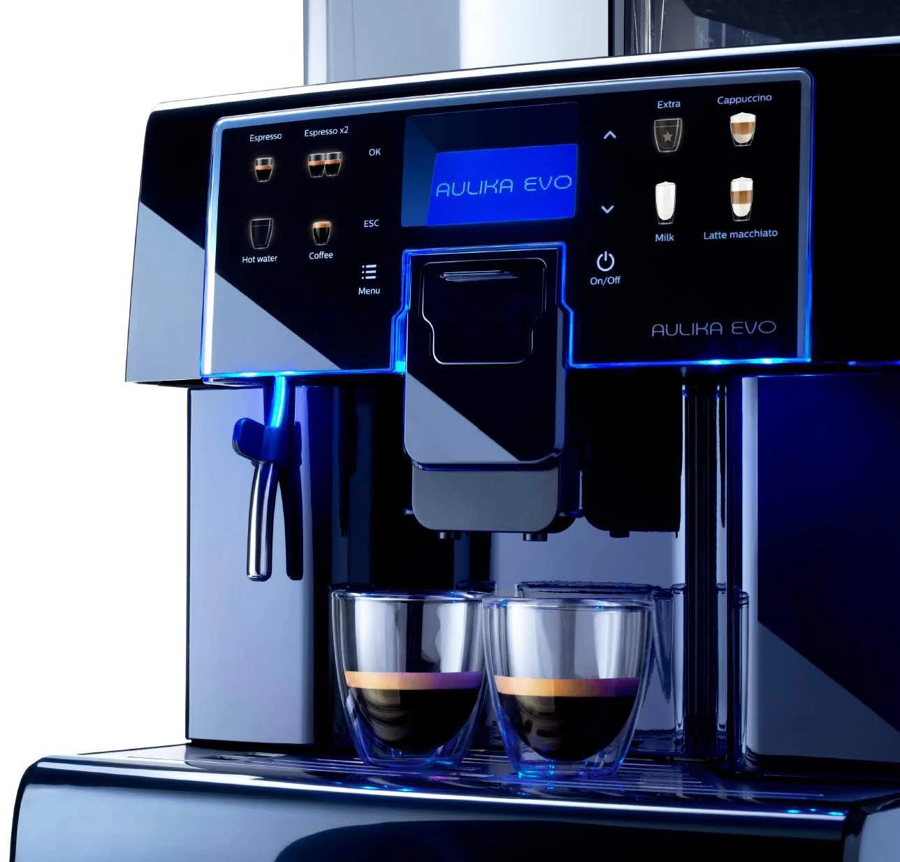 Aulika Evo Top Office is the latest addition to the Saeco range of professional coffee machines and characterized by innovative technological solutions and a clean and elegant design. To all this, Aulika Evo Top adds a touch capacitive interface with back-lit photographic icons, that make it easy to select the desired direct-to-cup beverage. Additionally, the dispenser area now sports a blue and white LED lighting to underscore the various phases of the brewing and confer another touch of style.